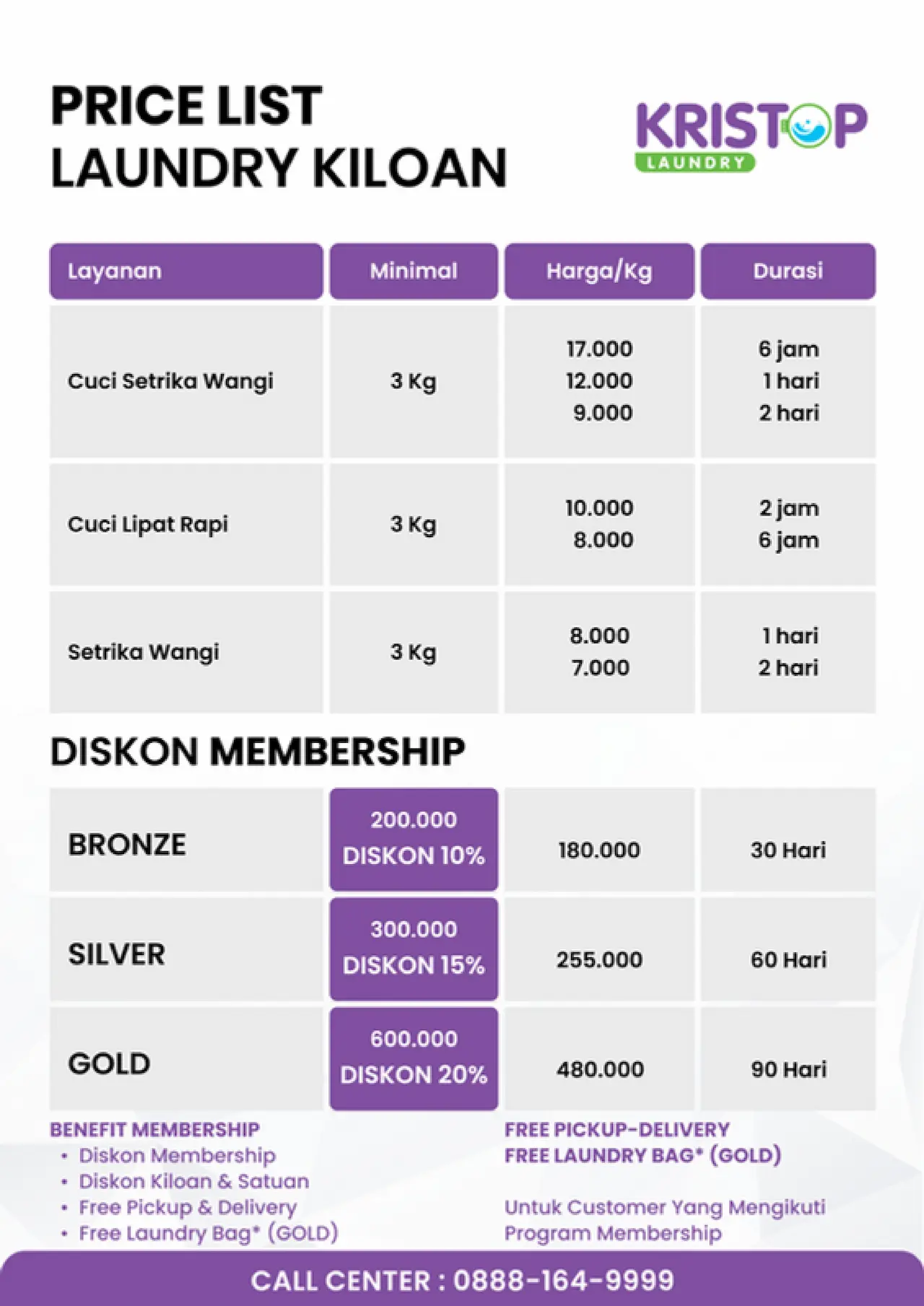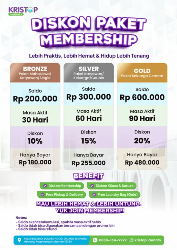 Nikmati diskon 10–20%, saldo lebih besar, masa aktif panjang, dan layanan ekstra untuk pelanggan setia Laundry Kristop. Cocok untuk mahasiswa, pekerja, keluarga, dan kebutuhan bulanan.