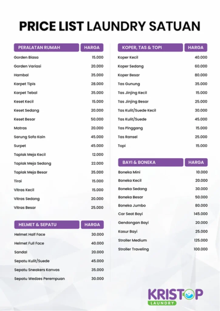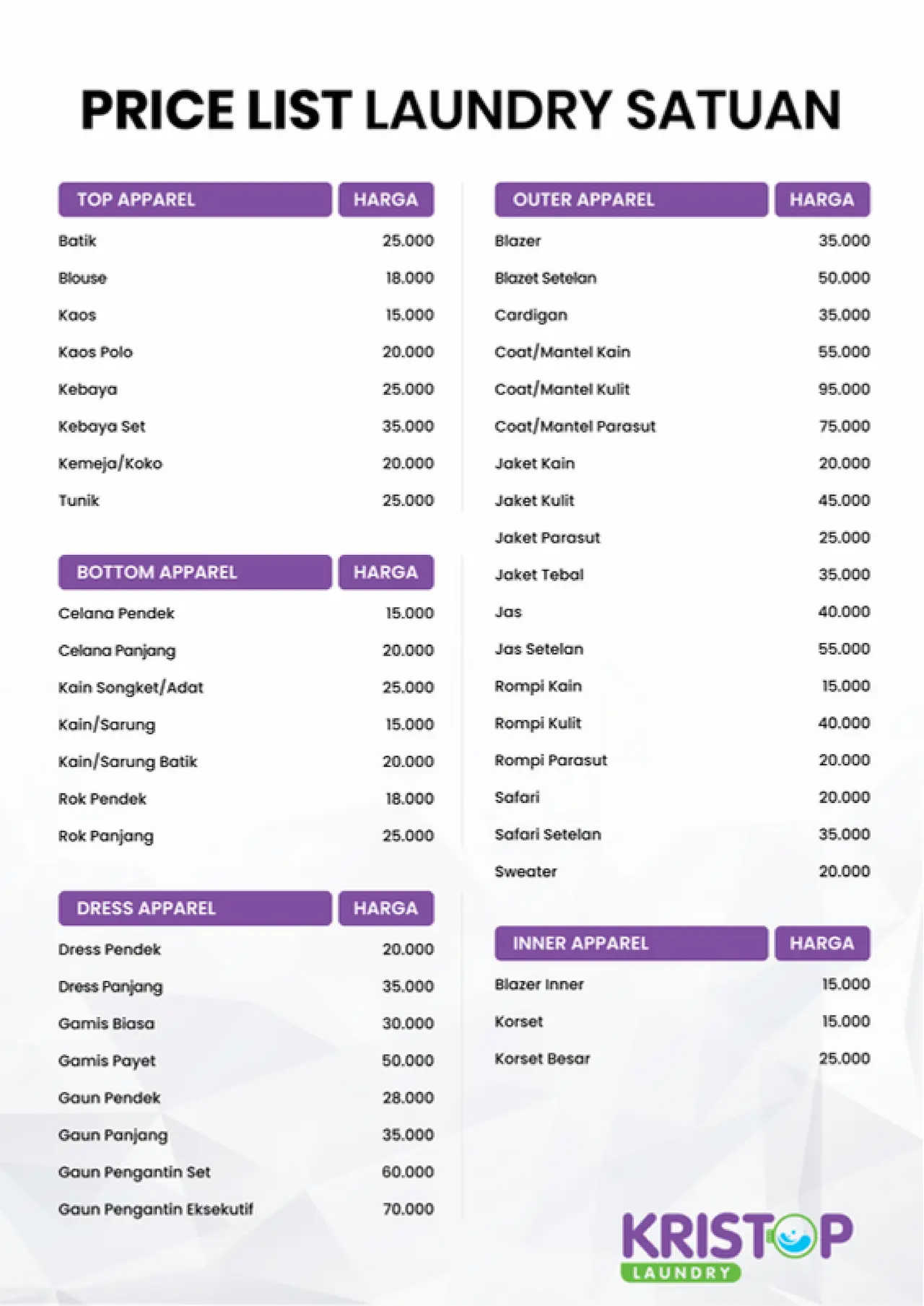 Termasuk cuci lipat, cuci setrika, satuan, dan express