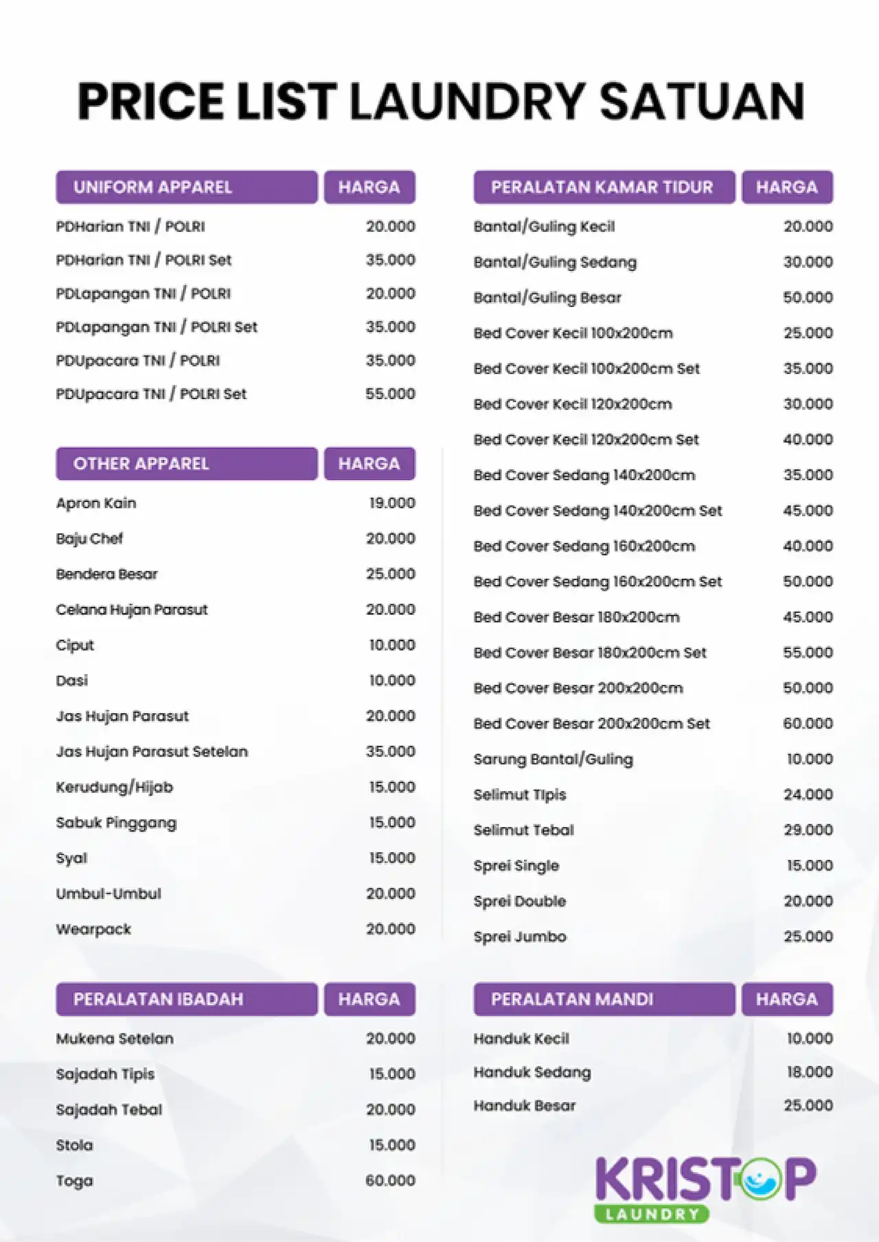Laundry Kristop adalah layanan laundry profesional. Kami menyediakan layanan laundry lengkap mulai dari cuci kiloan, laundry satuan, hingga express service untuk kebutuhan mendesak.